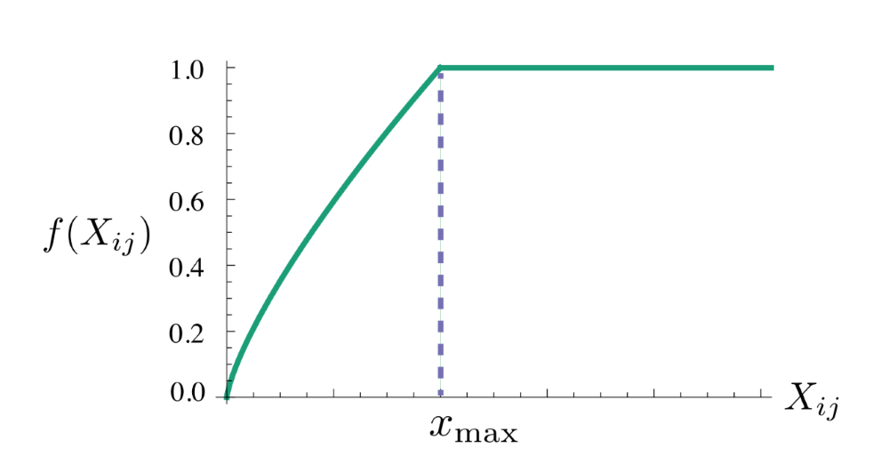 共现次数越大的赋予较高权重,较小的赋予较低权重。所以这个权重函数要是非递减函数(non-decreasing);