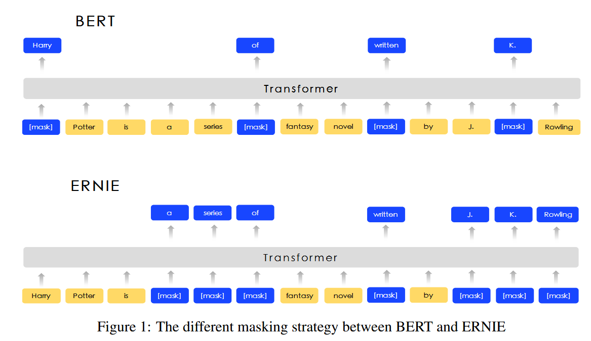 Learnt by BERT :哈 [mask] 滨是 [mask] 龙江的省会,[mask] 际冰 [mask] 文化名城。 Learnt by ERNIE:[mask] [mask] [mask] 是黑龙江的省会,国际 [mask] [mask] 文化名城。
