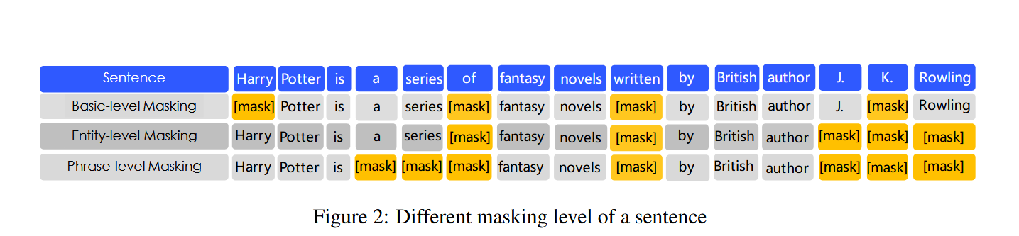 - 数据批次混合: 在每一个训练批次中,模型接收到的数据样本,有些是采用了基本级掩码,有些是短语级掩码,有些是实体级掩码。