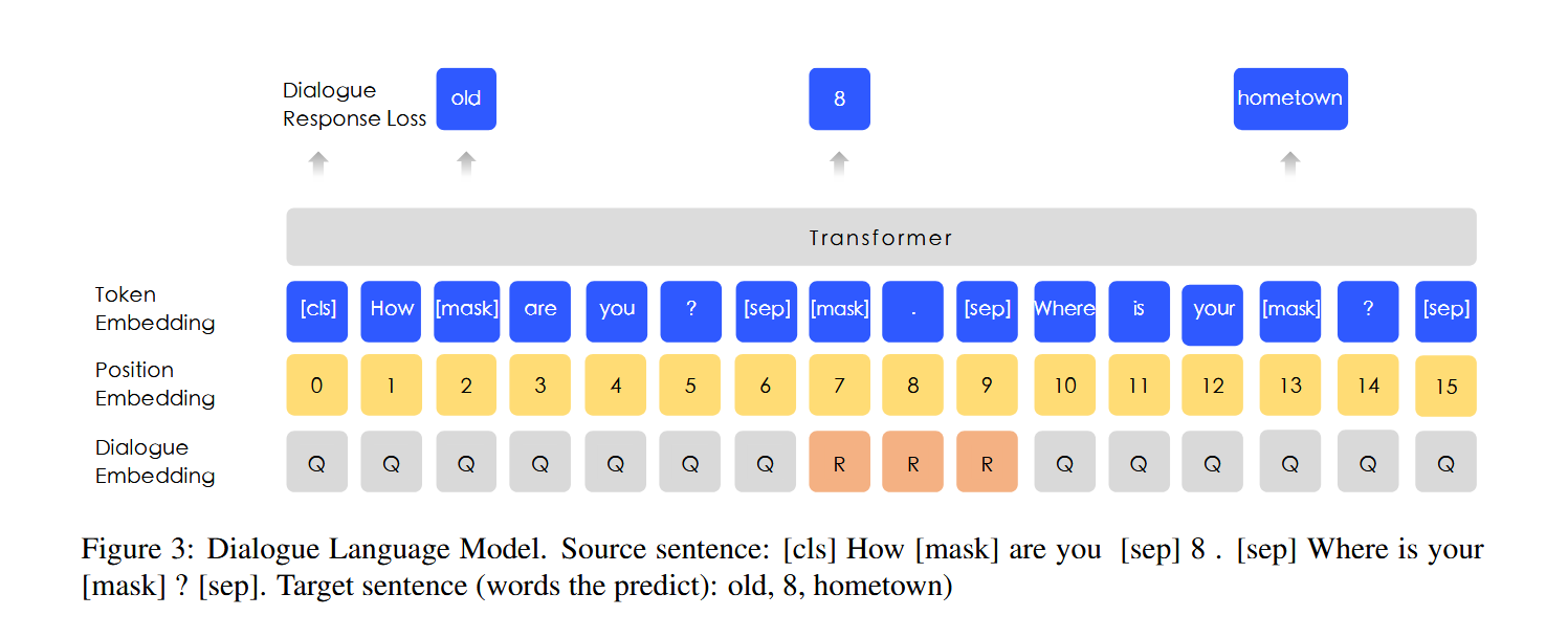 Dialogue data is important for semantic representation, since the corresponding query semantics of the same replies are often similar. ERNIE models the Query-Response dialogue structure on the DLM (Dialogue Language Model) task. As shown in figure 3, our method introduces dialogue embedding to identify the roles in the dialogue. ERNIE’s Dialogue embedding plays the same roles as token type embedding in BERT, except that ERNIE can also represent multi-turn conversations (e.g. QRQ, QRR, QQR, where Q and R stands for ”Query” and ”Response” respectively). Like MLM in BERT, masks are applied to enforce the model to predict missing words conditioned on both query and response. What’s more, we generate fake samples by replacing the query or the response with a randomly selected sentence. The model is designed to judge whether the multi-turn conversation is real or fake